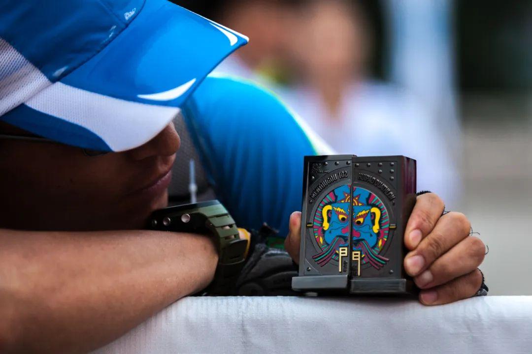 更令人津津有味的为门百赛事的奖牌,门字形的奖牌分为两部门,完成60公里越野只能得到一扇门,只要两项都完成的选手才气获得完好的门,有很多选手因越野项目被关门,只能获得半扇门。