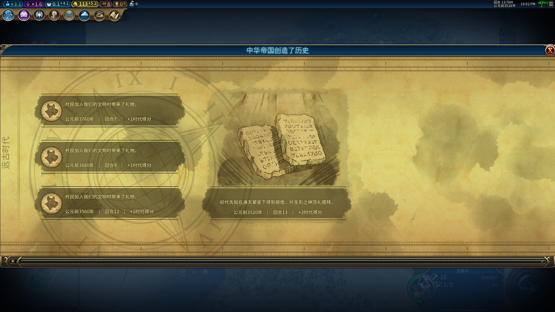 (图2.16 时代分)位于屏幕右下角汗青时刻是游戏历程中呈现严重事务的记录,例如成为首个选择新整体的文明、产生特色单元或建筑、发现天然奇迹。除此之外还有,总督到达更高品级、清理自家城S附近的蛮族寨子、初次成为城邦宗主国、从头夺回宗主国、超前研究下一时代科技、改进被天然灾祸摧毁过的改进设备。特定的奇迹也能够获得时代分。