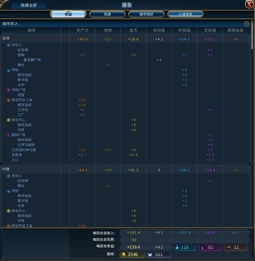 金币:左下角数字反映的是你目前国库的金币总数,右上角指数反响的是你当前回合产出的金钱,金币次要用于购置单元和建筑,特定情况能够购置区域,还有与其他文明领袖停止交易,建筑和单元的破费和晋级。金币的获得有:生齿数量、贸易中心或港口、政策、城邦使者、地块产出(奇迹、豪侈资本、鹿)、商业道路、商品交易、宗教崇奉以及特殊的文明和领袖才能。