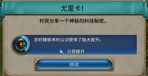 (图2.5 尤里卡)尤里卡(提拔前提):完成该前提能够获得该科技的尤里卡,尤里卡能够缩短该科技40%的所需瓶子,好比箭术本来需要50瓶子,当我触发了尤里卡后,只需要再投入50*(1-0.4)=30的瓶子。(尽可能的触发尤里卡能够有效地缩短科技树的解锁时间,能够更快变得强大,落后就要挨打。但不要过于重视尤里卡而耽搁关键科技的解锁,招致错失时机)