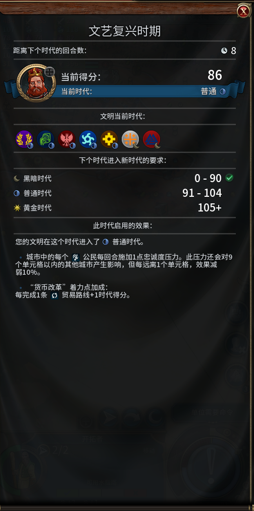 (图2.27 时代进度)时代进度表能够看到目前文明所处的时代、时代得分、时代使命和下一个时代的回合数。