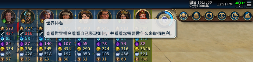 文明头像:最右侧为玩家的头像,在地图上,每碰到一个其他文明,其领袖头像就会显示在上方,能够点击头像与目的文明停止交换。