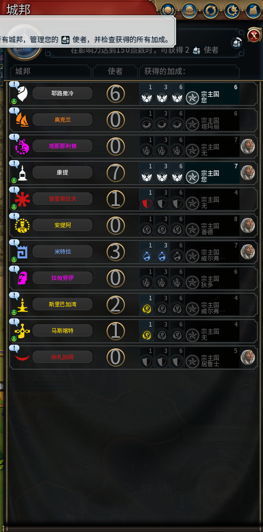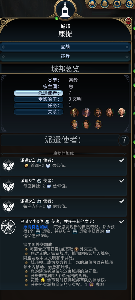 当你的调派的使者多于其他文明(且≥3),你即可成为那个城邦的宗主国。