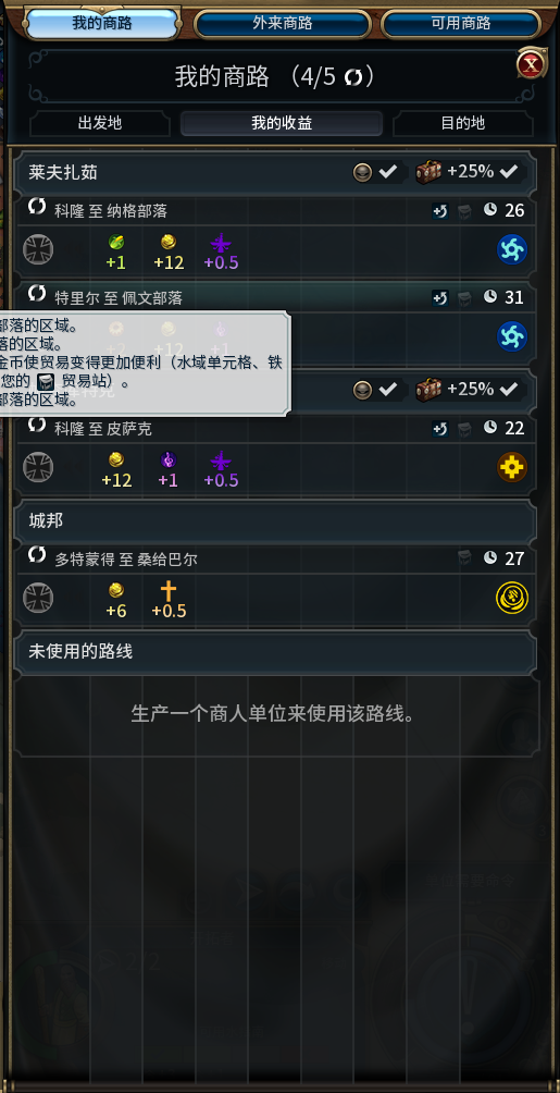 (图2.24 商业道路)商业道路:能够看到目前玩家所拥有的商业道路和其产出。