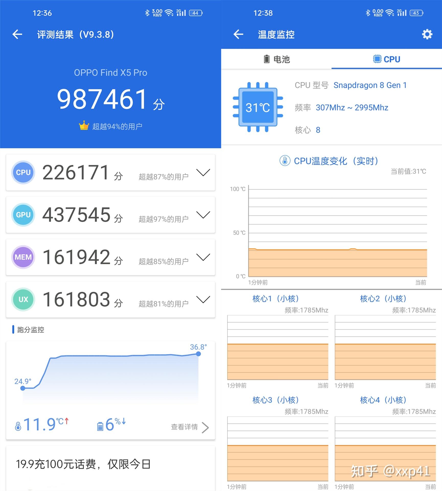 OPPO Find X5 Pro 做为 OPPO 旗舰机型,装备了目前安卓手机的顶级挪动平台:骁龙8Gen 1处置器,它的性能表示出高能旗舰水准。在安兔兔跑分中,OPPO Find X5 Pro总得分为987461(CPU:226171分,GPU:437545分,MEM:161942分,UX:161803分)。在Androbench中闪存挨次读写别离到达了1631MB/s和1244MB/s,可见它的性能各方面确实很强悍。