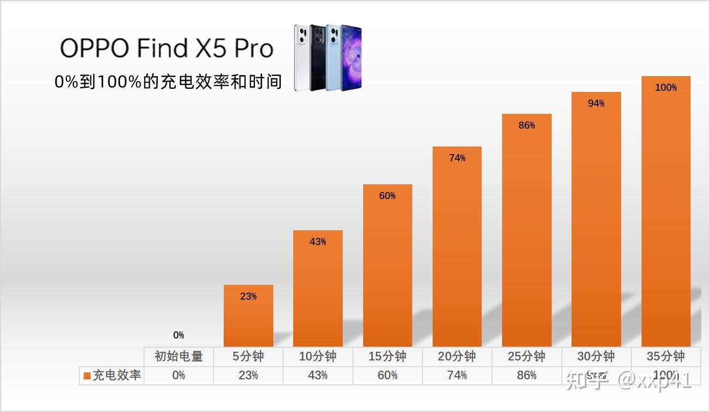 OPPO Find X5 Pro 从0%充电到100%的效率和充电时间,情况室温22℃,每5分钟记录一次充电量,统计绘造而成上图表,通过柱形表能够看到OPPO Find X5 Pro 的充电效率,实测根本和官方给出的充电效率一致,确实能在35分钟内充满100%的电量。
