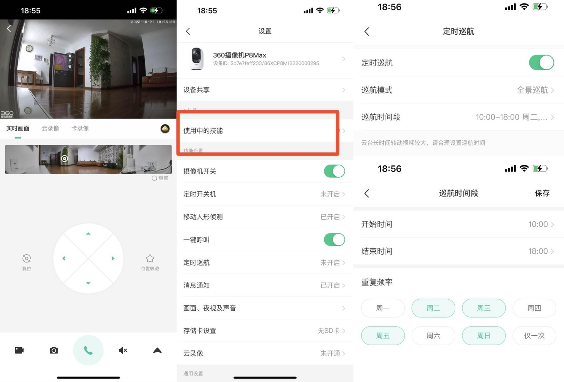 接下来看看360那款新品8max,它也是360首款云摄像机。它有着比其他几个产物更宽广的角度(后面有测试)。设置菜单里能够开启按时巡航,按照本身家的情况来精细的设置。