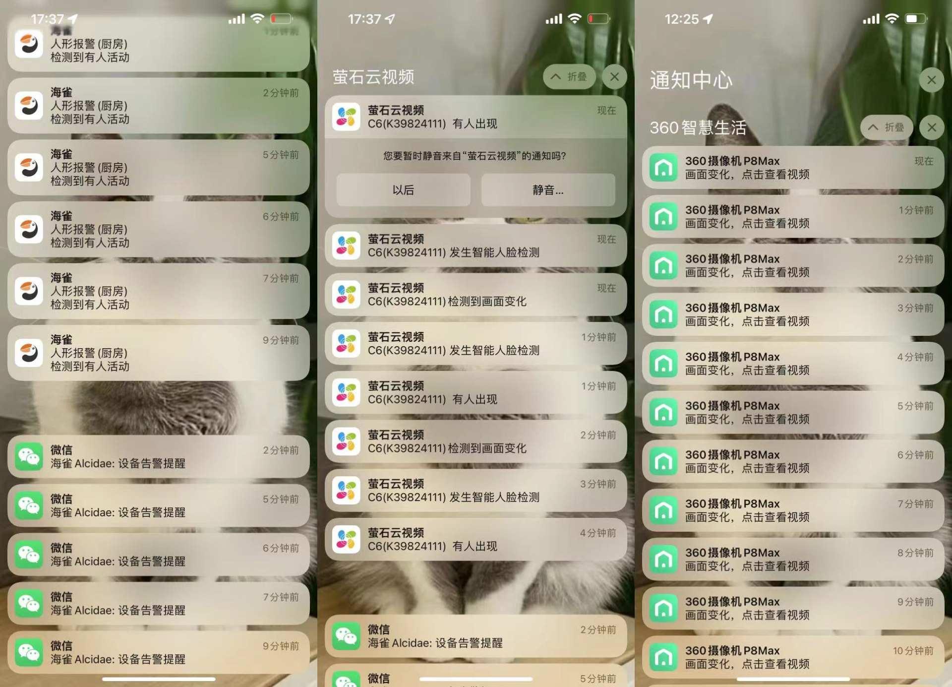 海马几乎没有安防报警推送(自己它也是一台儿童关照机)。别的三台的报警都十分灵敏,几乎人一走过去马上就有推送,此中海雀(最左侧)的公家号也是实时推动静。