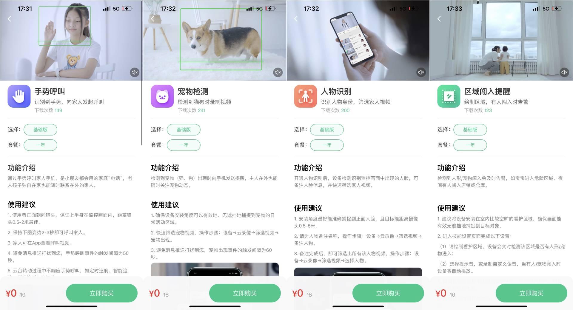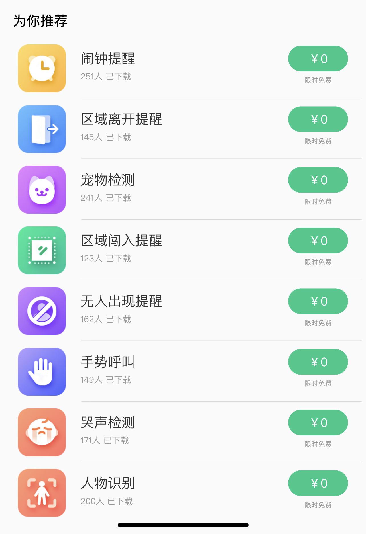 360的APP里值得拉出来零丁讲一下的就是它的AI技能商铺--上图中红圈里的菜单“利用中的技能”,里面列举出了那台摄像头能够安拆的所有安防监控技能。