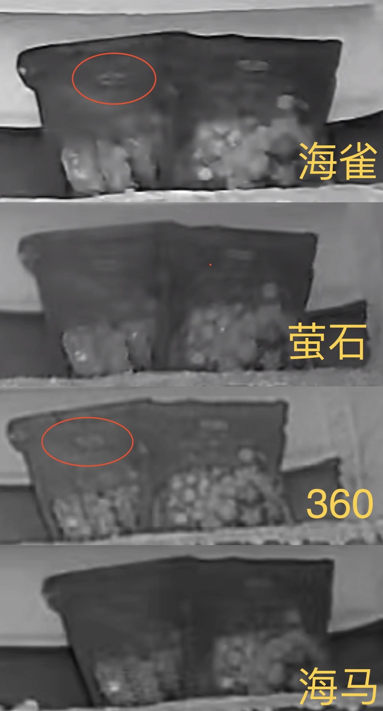 画面里蘑菇袋子上的包拆细节处海雀和360是表示更好的,别的两款的涂抹感比力严峻。而360有着最广的视角,却也能依稀分辩出两个袋子上半部门的山姆logo,和海雀表示一致,申明360的500W分辩率是实打实的。别的两台则只能分辩出右侧袋子上有logo,左侧的看不清。