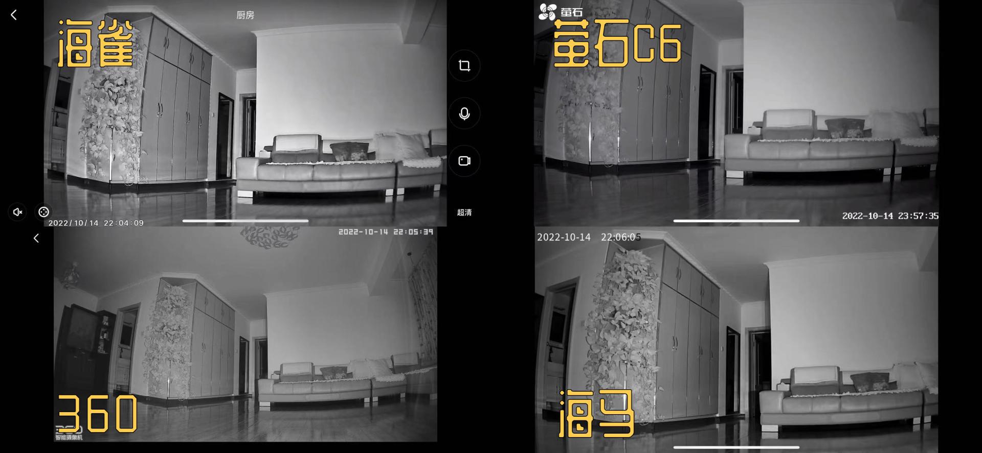 最初再比照一下夜视效果。四台摄像头都搭载了红外线补光灯,晚间没有光线照明时会主动启动供给辅助照明。那是我家的深夜,爸妈已经入睡以后屋子里一片乌黑时录的。