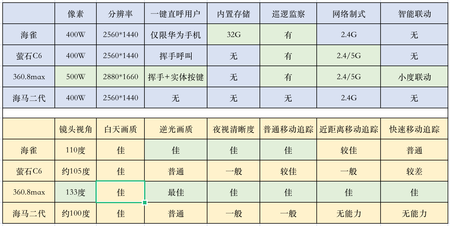表格解读:外不雅和APP功用方面各有所长。海雀是独一微信和APP双报警的;360的8max是独一能一键与手机app用户通话的,也是独一有500W像素的;萤石C6有人脸识别功用不外仿佛用途其实不算大。海马是一台儿童关照机,固然有云台和识别,但是用它做安防是不保举的,用来关照宝宝是能够考虑选择海马的,它的睡眠监控等功用都很合适。