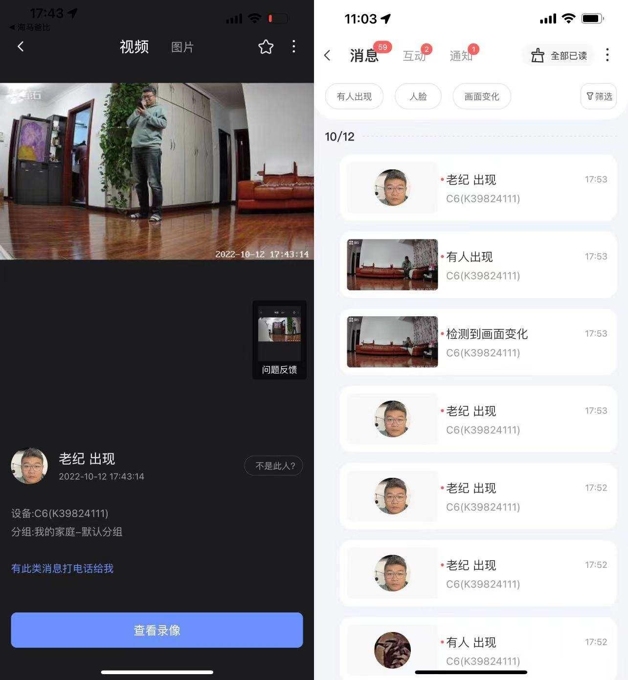 2.2萤石C6界面相差不大,萤石有一个智能算法,能够按照需要开启差别的功用,其实和上面海雀的差不多,只是换个款式罢了。值得一提的是C6有小我脸识别,提早录入人脸,它会检测到是哪小我。