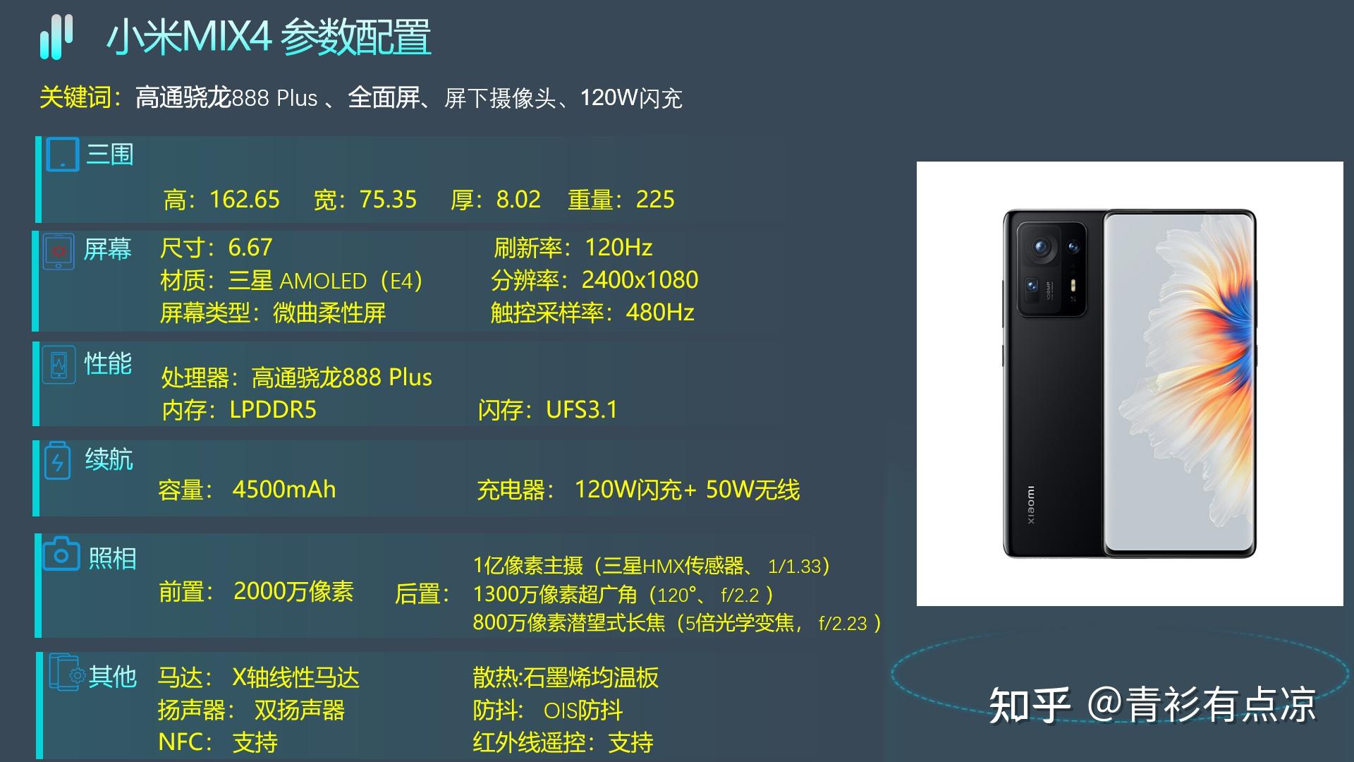 撑持屏下摄像,小米首款全面屏机型,带来更好的不雅影视野和沉浸感一体化全陶瓷设想,机身后背天衣无缝,手感很不错,颜值也十分高,出格是影青灰搭载骁龙888+处置器,X1大核主频由2.84GHz提拔到3.0GHz,3D Mark Wild Life 跑分5821,小白数据库排名第9,性能强悍后置1亿像素主镜头,HMX传感器,1/1.33大底,撑持光学防抖,摄影效果很能够,十分明晰撑持120W超等闪充,15分钟即可充满,回血速度快选购建议: