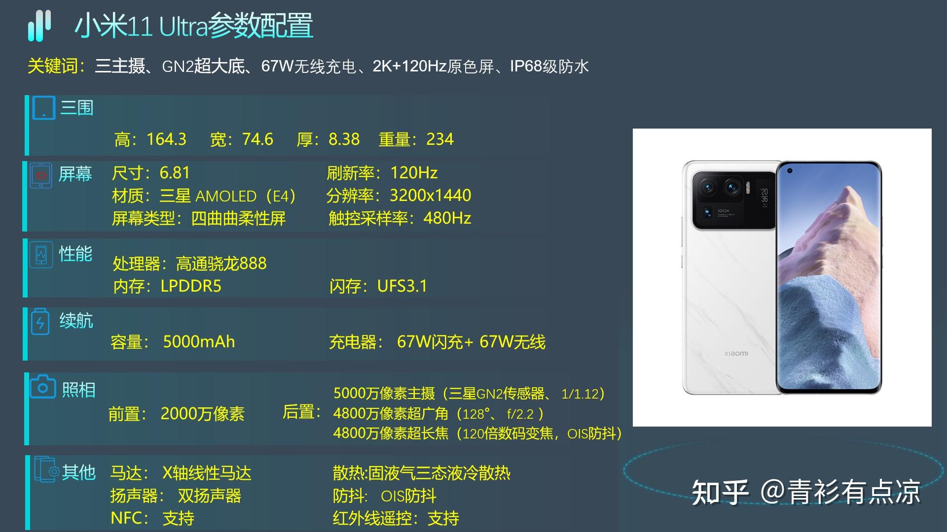 陶瓷机身设想,触摸后盖光滑细腻,不外机身侧重,234g屏幕实力TOP3,6.81英寸E4材量AMOLED四曲面柔性屏,2K+分辩率,120Hz分辩率,480Hz触控采样率,撑持10亿色显示HDR10+高通骁龙888处置器、满血版LPDDR5、满血版UFS3.1,性能抢眼,安兔兔跑分达78万分独一一款接纳三主摄计划手机,5000万像素主摄、4800万超长焦镜头、4800万超广角镜头,顶级摄影程度5000毫安大电池,撑持67W有线闪充,67W无线闪充,小白数据库续航才能排名第四,续航才能十分不错选购建议: