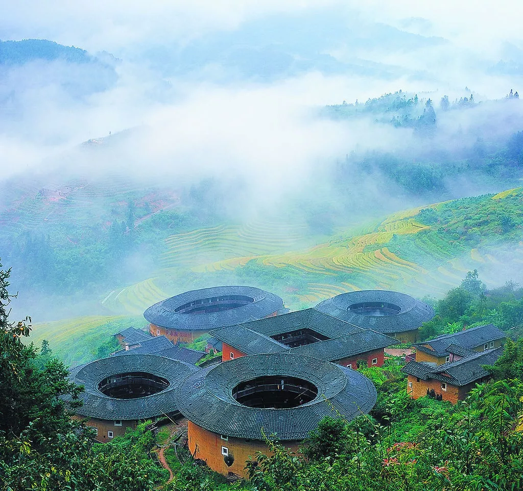 五凤楼、围龙屋、圆楼和方楼都是他们的满意之做,好像一个个几何符号,散落在梯田之侧、溪水之畔,以至密布整条山谷,构成连绵10余千米的土楼长城。