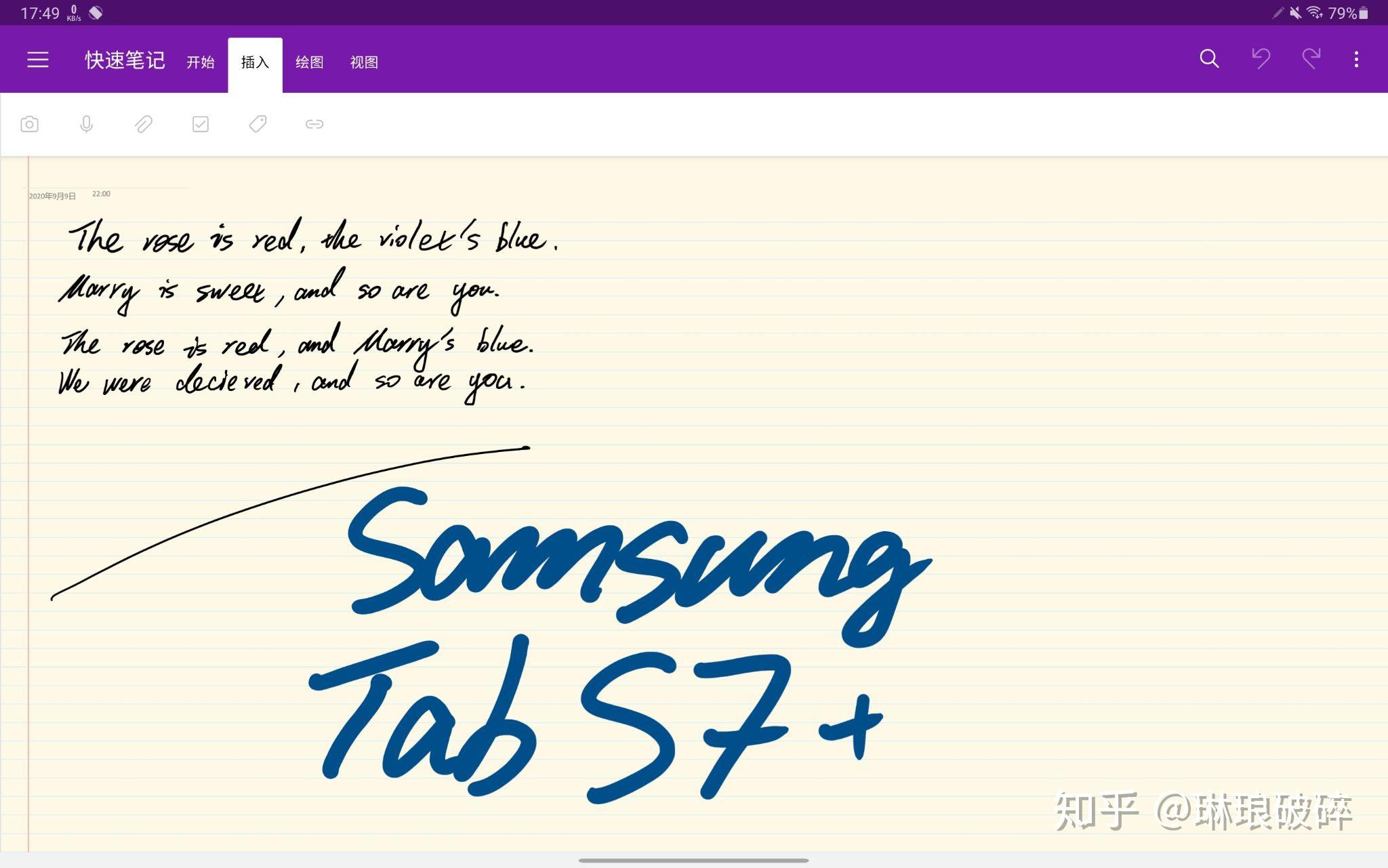 然后就是重头戏——手写笔了。我认为那只笔是Tab S7+的灵魂,没有那只笔它底子不配做iPad Pro的敌手,而一旦有了那只笔,那么至少在手写那方面,三星是能够超越苹果的。