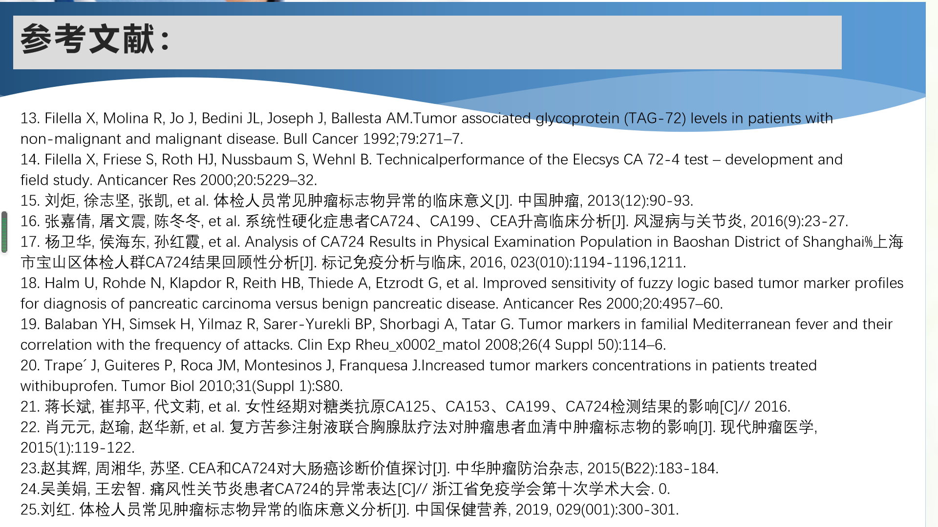 c:一块测的其他消化道肿瘤标记物(如CA19-9、CA242、CA50、CEA、PGI、PGII、G17等)若是一般,只要CA72-4高,根本确认是良性病或上述药物干扰等引起的CA72-4高。