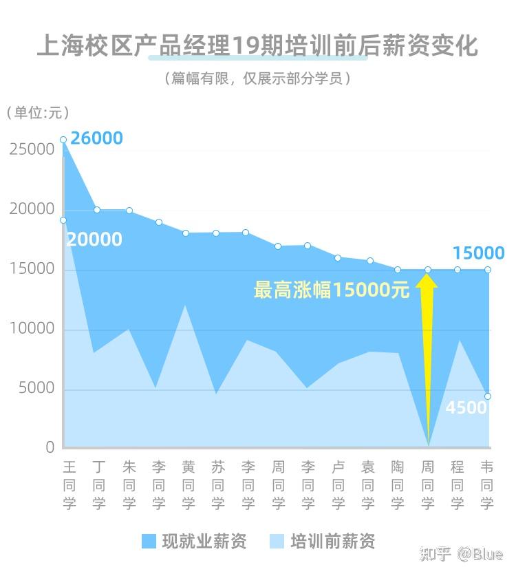 以产物司理为例,上海校区19期产物司理培训前班级均匀薪资8000+,仅2个半月培训后均匀薪资16198,涨幅近100%,更高提拔15000元!