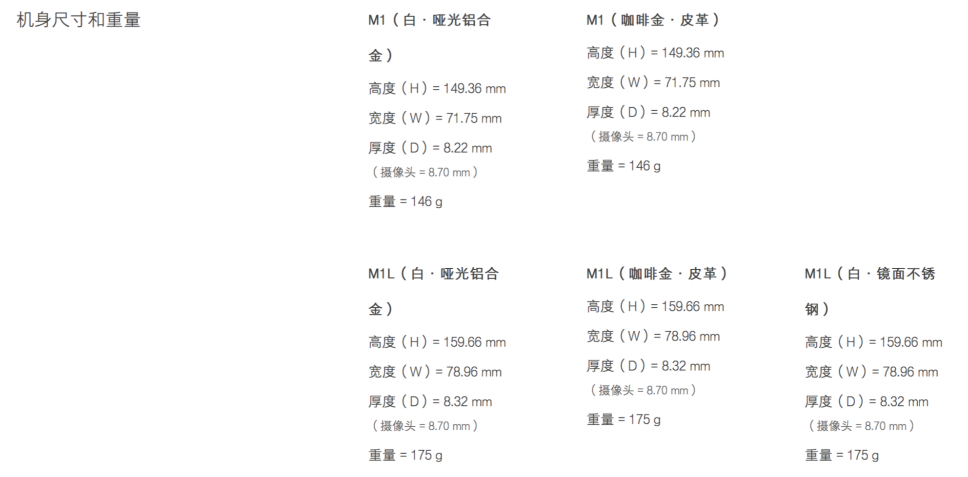 比拟 T1、T2 上的 4.95 英寸屏幕,M1 和 M1L 的屏幕大了很多,此中 M1 的屏幕尺寸为 5.15 英寸,M1L 为 5.7 英寸。凡是来说,屏幕大了,机身会更重,但 M1 和 M1L 却并没有明显的「增重」。