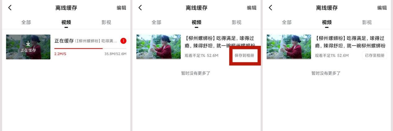 APP里能够间接查看缓存后的视频,点击右下角有一个保留到相册,就能够把视频保留到手机当地了。