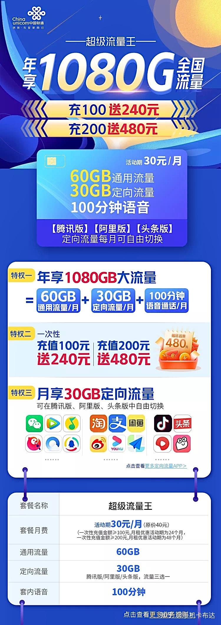 ❤️套餐介绍:30元/月=60G/月全国通用流量+30G/月定向流量+100分钟通话,持久套餐!