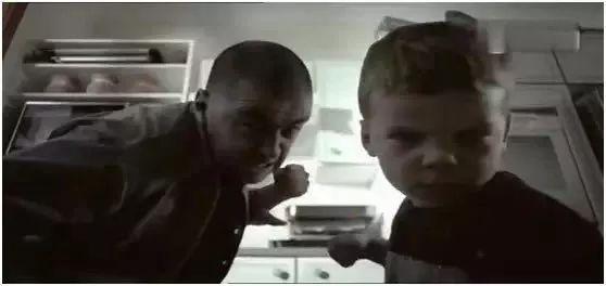 父亲对人大呼小叫,握着拳头威吓别人,年幼的孩子也做出同样恶狠狠地脸色与威胁动做;
