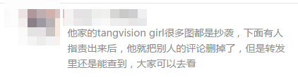 TANGVISION盗图,偷吃新人甜品,搞丢照片不负责任等等。此次他炒做也好营销也好,盗用别人做品是一个摄影师不成冒犯的道德底线。