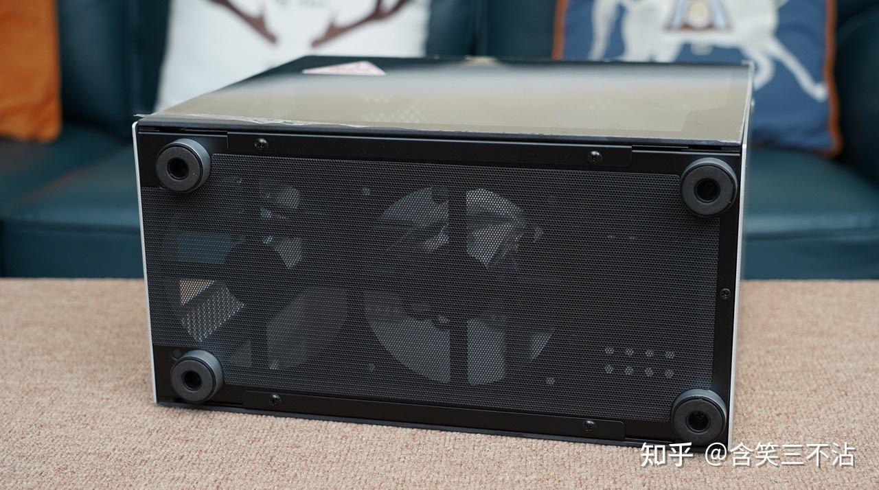底部撑持安拆2把120电扇,并设置装备摆设了防尘网,别的,想要翻开机箱的两个侧板,需要拧下底部的4个螺丝。