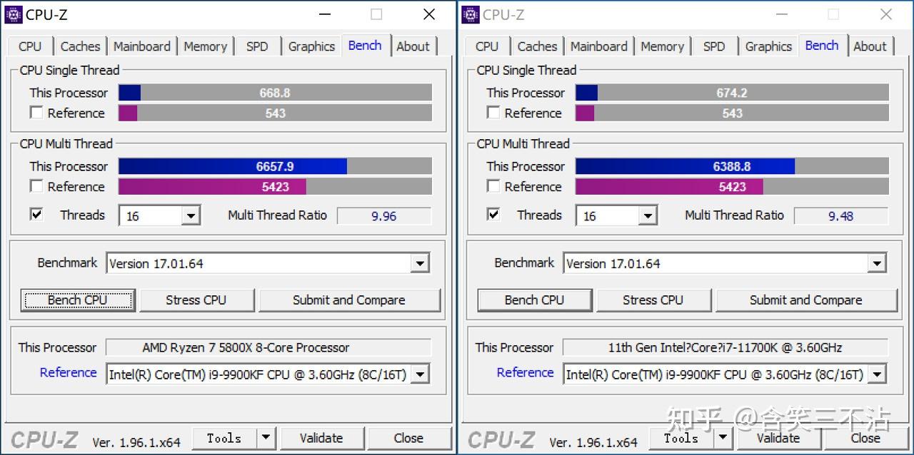 CPU-Z基准测试,单核性能11700K略胜一筹,多核性能则是5800X占优。