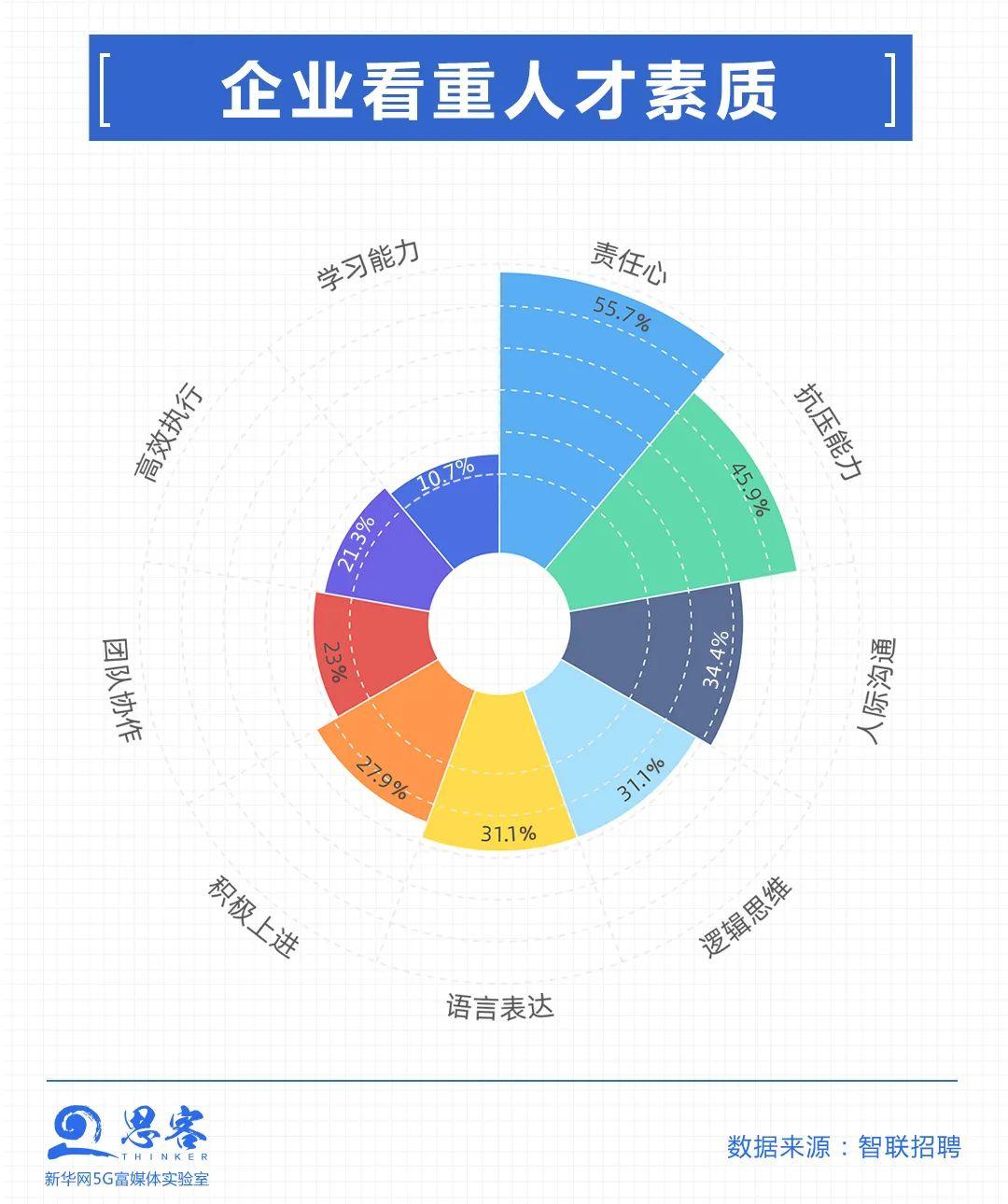 求职者的责任心、抗压才能、人际沟通才能最受企业存眷。有阐发认为,差别的企业有差别的用人尺度,思维才能、行为才能等可通过工做理论不竭习得,而责任心和抗压才能则更多依赖于小我品量。