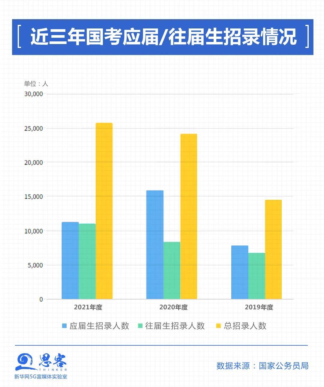 与此同时,2021年度国考同比去年扩招了6.62%,共招录25726人。此中,2021年应届生招录人数占比57.4%,往届生招录人数占比42.6%。