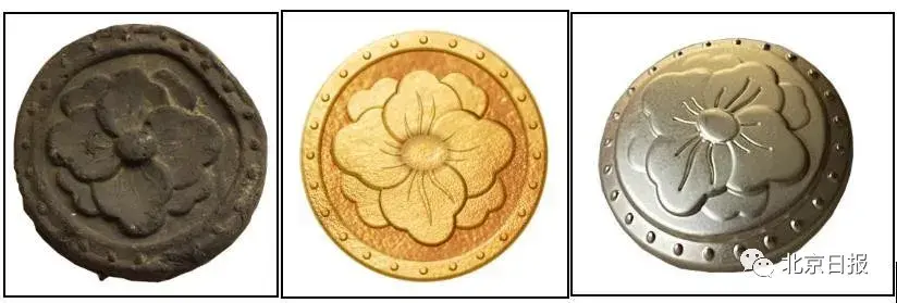 外套面料提花男拆纽扣以五角星为图案。女拆纽扣为牡丹纹,源自战国期间的瓦当纹样,简洁大气。