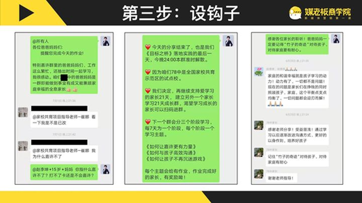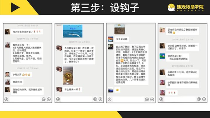 第三步,设钩子。若是你参加我们的微信群,对峙打卡7天以上,我就能够免费赠送你第2罐。许多人也会跟着群里的伙伴们一路打卡,互相祝福对方。