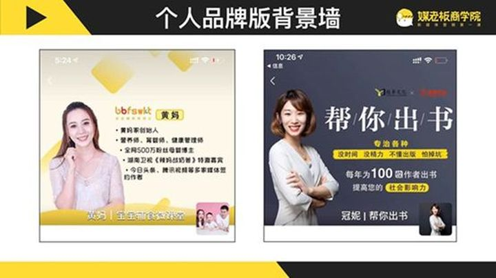 其他的小我品牌的例子例如说黄妈,她宝宝辅食微课堂的开创人,还有我刚刚说的冠妮,加上的标签帮你出版之后,她的伴侣圈布景调整了,并且愈加强化卖点了。