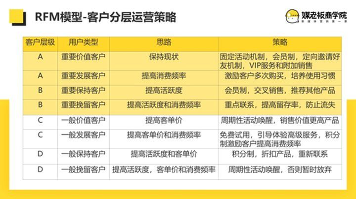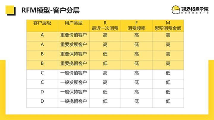 第三,做好用户分层。每个用户的价值是纷歧样的,凡是是20%的用户奉献了80%的业绩,所以我们要重点维护好价值高的客户。