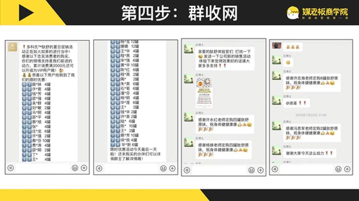第四步,群收网。在打卡了半个月之后,大部门的顾客已经把之前免费赠送的产物喝完了,那时候我们就能够在群里组织拼团活动,超越30%的用户都参与了拼团,所以复购率高达30%以上,2个月销售1300多罐,累计销售额40万,消费的第一批货已经卖光了。