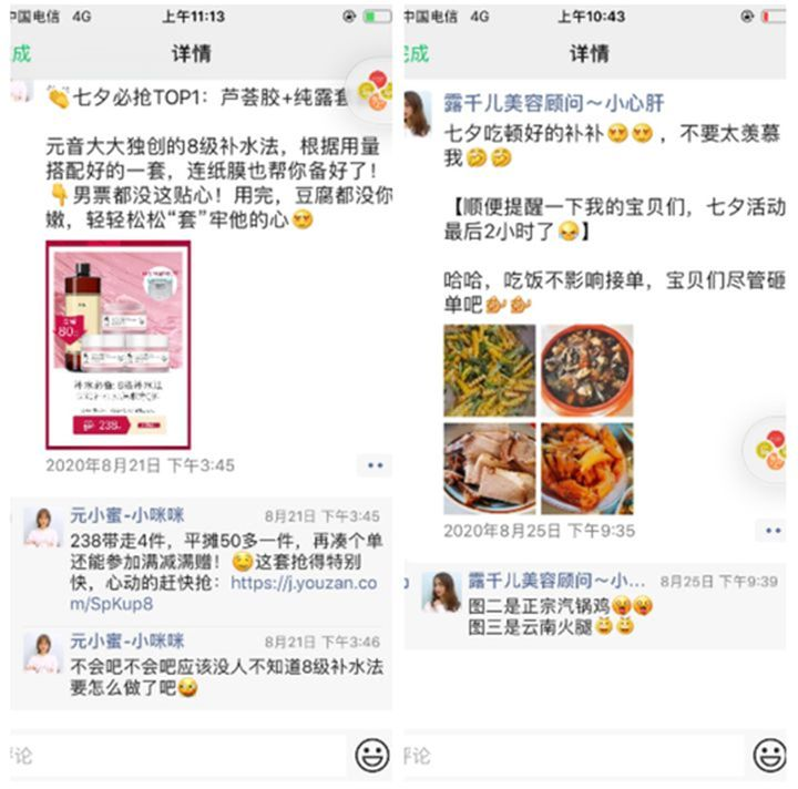 第二点是做好伴侣圈规划。伴侣圈内容能够归类4类: 分享式伴侣圈,娱乐式伴侣圈,处理问题式伴侣圈,销售式伴侣圈。我以一个学员的案例详细拆解那4类内容,那是一家美妆电商,叫露千儿,通过私域运营,客单价提拔2倍,私域业绩提拔4倍,一路看看她们是怎么发伴侣圈的。