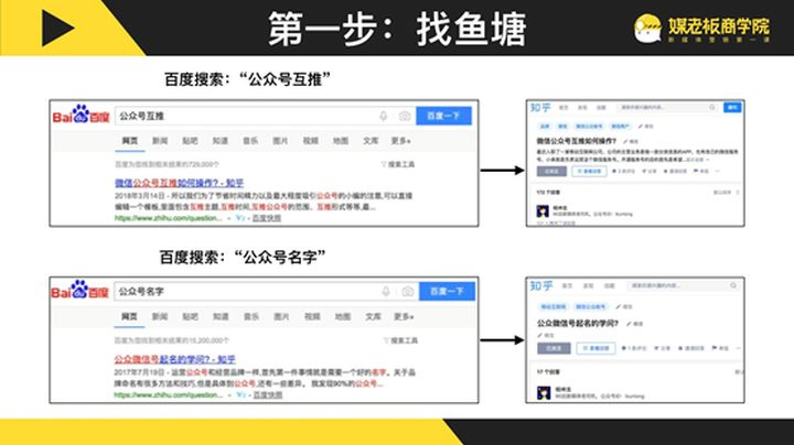 第一步,找鱼塘。最早我是教各人若何运营公家号的,所以我的目的用户,就是需要运营公家号的人,我在百度搜刮公家号互推、公家号名字等那些关键词后,发如今百度首页的链接竟然是知乎的,那是一个很重要的发现。
