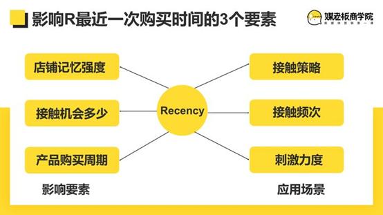 先来看R(比来消费时间),影响R比来一次购置时间的3个要素:店铺记忆强度,接触时机几,产物购置周期。关于近期没有消费的客户,我们通过差别的接触战略,接触频次和**力度来影响和维护客户。