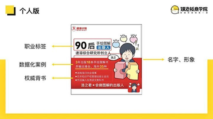 他有个比力好的处所就是它有数据化的案例,3年出书18本手绘图解书,并输出港台海外35地,再加上权势巨子背书,就很有说服力了,再加上本身是手绘插画师,所以有很都雅的漫画形象。以上那个就是小我品牌版,尺度的模板,供各人参考。