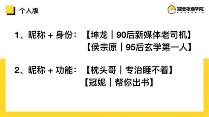 若是你是小我,我们建议有两种定名体例,第一种是昵称+标签,好比,坤龙,90后新媒体老司机。