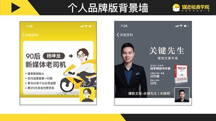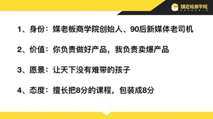 第一类,身份申明。好比媒老板商学院开创人,90后新媒体老司机,简明扼要地申明你的身份。