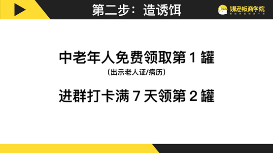 第二步,造诱饵。其时我给的建议十分简单粗暴间接送,但是需要加一个附加前提,你必需出示白叟证或者病历,证明你刚刚做完手术,只要出示肆意一样,你就能够免费领取一罐我们的卵白肽。
