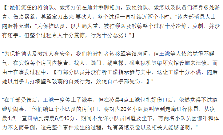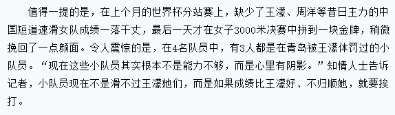那是一个晚上,中国短道速滑队的队员遭到了丽江保安的殴打。但是其时的王濛与锻练等人在一路,底子不在事发现场,也没有和本地保安有任何接触。但是对媒体来讲,王濛就是短道速滑的第一明星,媒体将王濛描画成一个带头打架的队长,并且还有鼻子有眼的报导,王濛在打架中说“我是奥运冠军”“我是人大代表”(王濛并非人大代表)