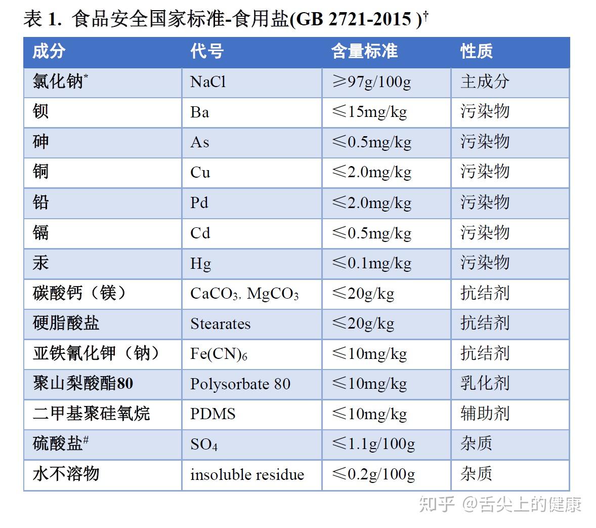S场销售的食盐品种繁多(图1)。因来源、造法、添加物等差别,良多盐被商家付与了“奇异”的功用。那些强调宣传一方面为居民选购食盐带来了猜疑;一方面可能干扰高血压、糖尿病等慢病的防治。2016年9月22日起头施行的《食物平安国度尺度-食用盐》(GB2721-2015)规定,食盐中氯化钠含量应≥97.0克/100克;钡含量应≤15mg/kg。通俗食盐除了碘和防结剂,不克不及添加其他物量;低钠盐可添加氯化钾。中国食用盐尺度参考国际食物法典委员会(Codex Alimentarius Commission)造定的《食用盐法典尺度》(CODEXSTAN 150-1985),对食用盐杂量和添加剂含量停止了严酷限造(表1)[4]。