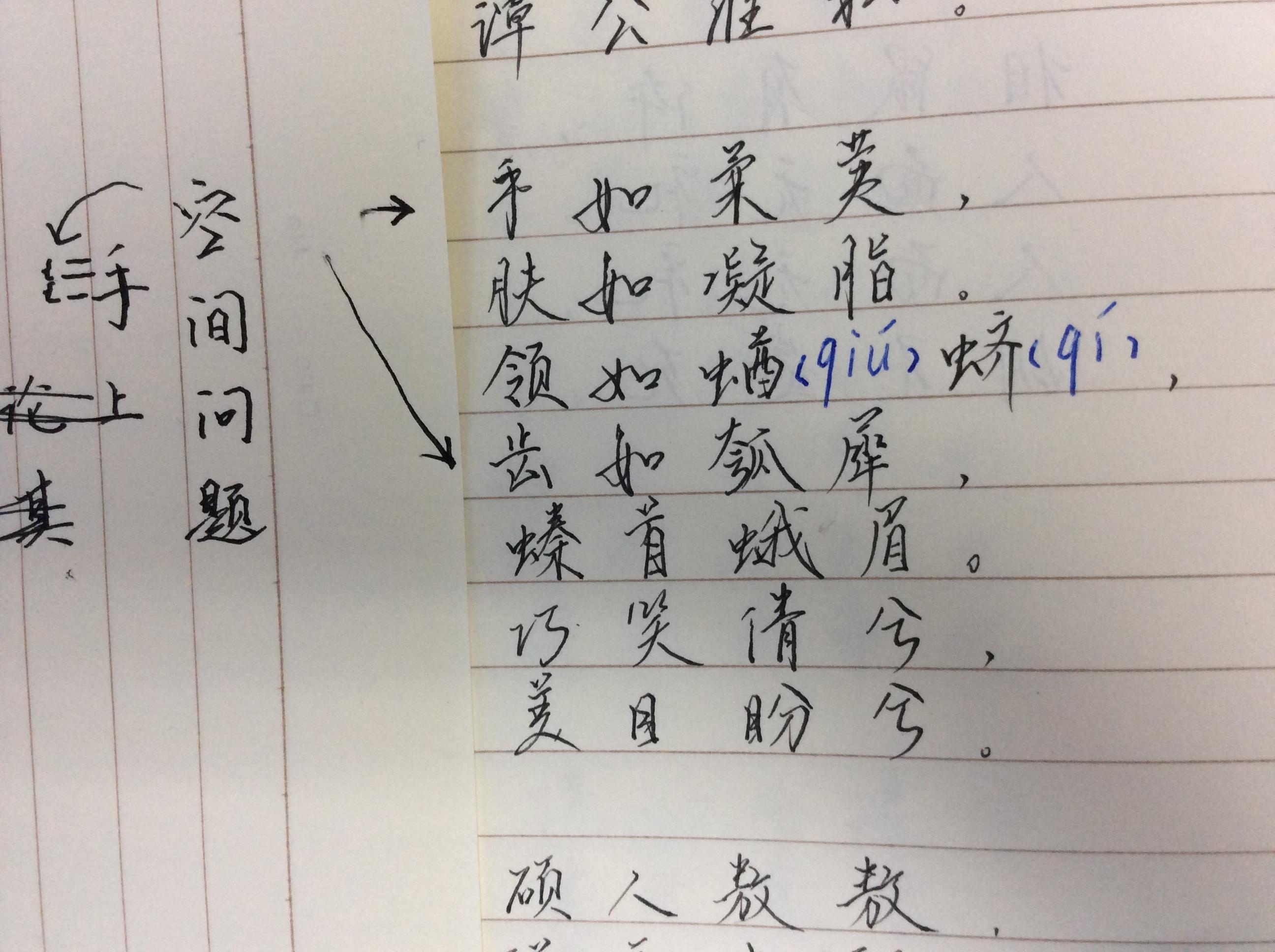 如“肤如凝脂”的“脂”、“领如蝤蛴”的“蝤”,摆布偏旁空间处置都不完美。