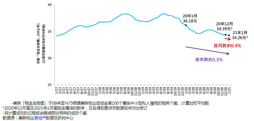 ▲ 图源:国联物业按照国联租金图象阐发,本年1月份以适用占空中积排序的私家室第,均匀值呎租期34.26元,按月连跌5个月,下降幅度约0.4%,比起去年1月均匀值约36.18元,上涨约5.3%。