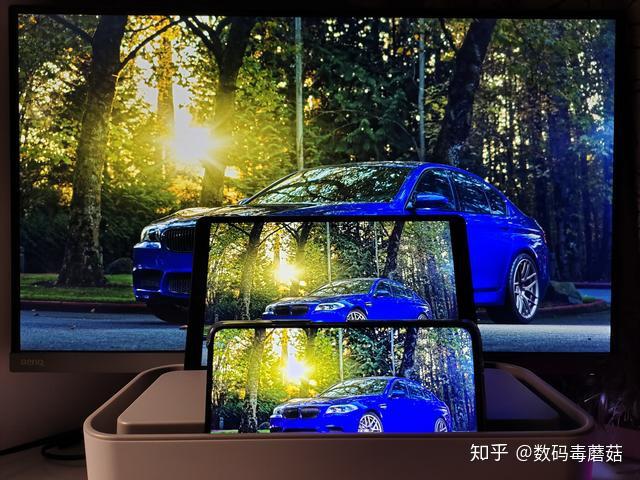 那块屏幕给人的第一觉得是有点儿暗+黄,我觉得是默认亮度有点儿守旧了,把亮度调到50%以上效果还不错。布景屏幕为明基EW2780Q,应该是本质更高的2K显示器之一;最前面的智妙手机则是荣耀X10,同样是LCD的液晶面板。