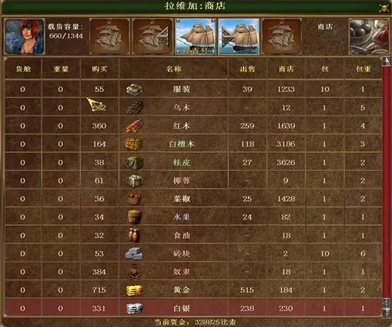实心球弹、葡萄弹、链弹、爆裂弹、火药、食物、兵器、药品、帆布、船板、可可、咖啡、烟草、蔗糖、小麦、酒类、朗姆酒、啤酒、棉花、亚麻、皮革、丝绸、服拆、乌木、红木、白檀木、桂皮、椰蓉、菜椒、生果、食油、砖块、奴隶、黄金、白银——一共35种货物...若是再算上游戏内做为配备但是也能够交易的10种火炮,那么玩家能够在航海形式下用于交易的货物就有足足45种了!有良多游戏所有的道具数量加起来可能都还没有45种呢!